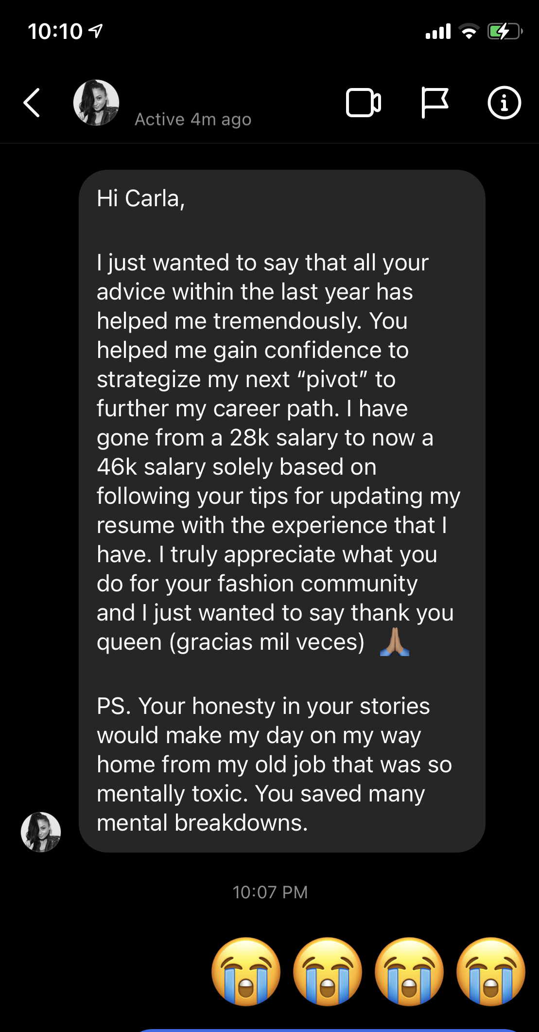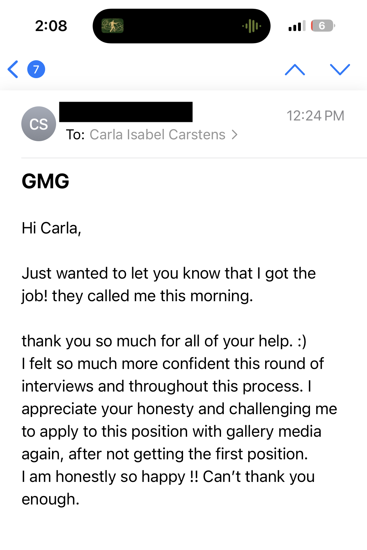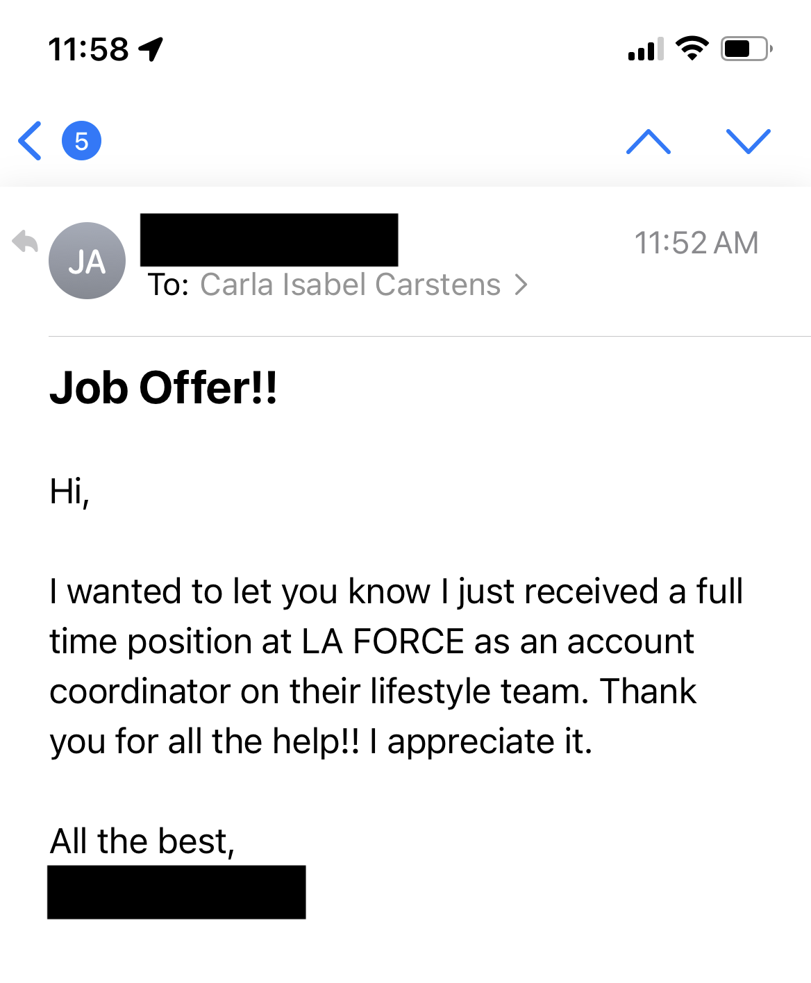 After one session reviewing her resume and reframing her story, she applied for a social/content role. Using the outreach strategy I taught her, she contacted the hiring manager directly.