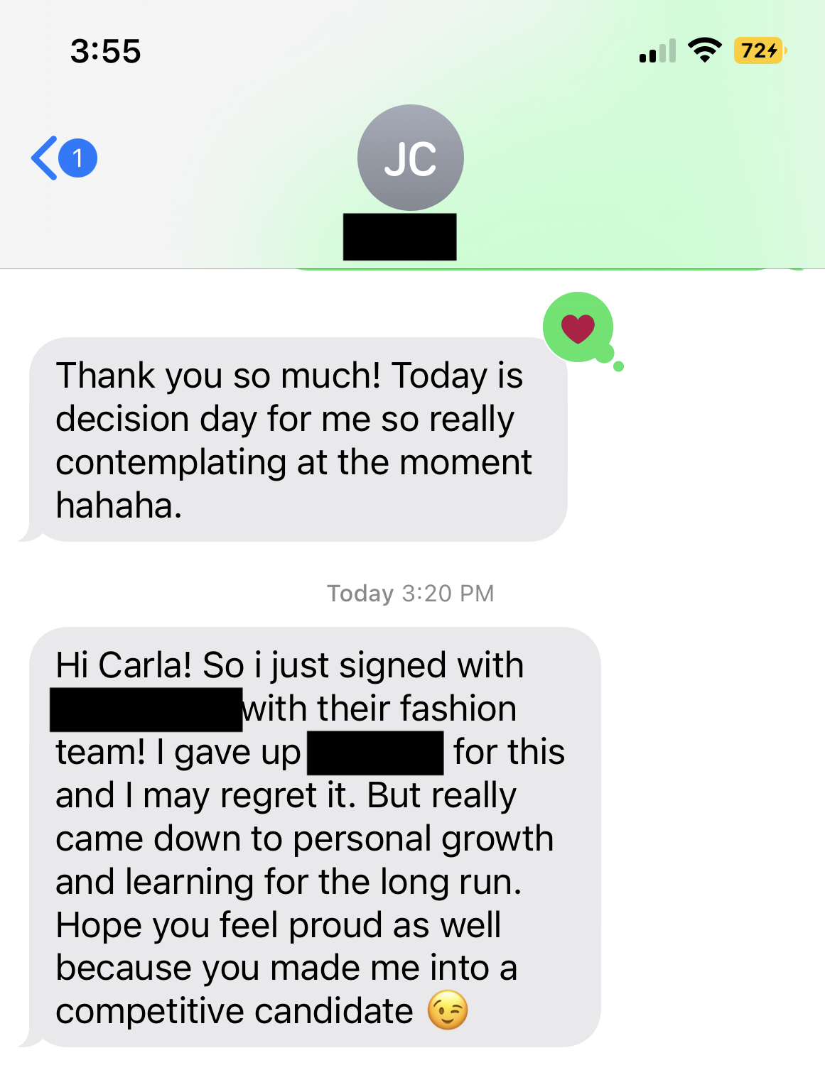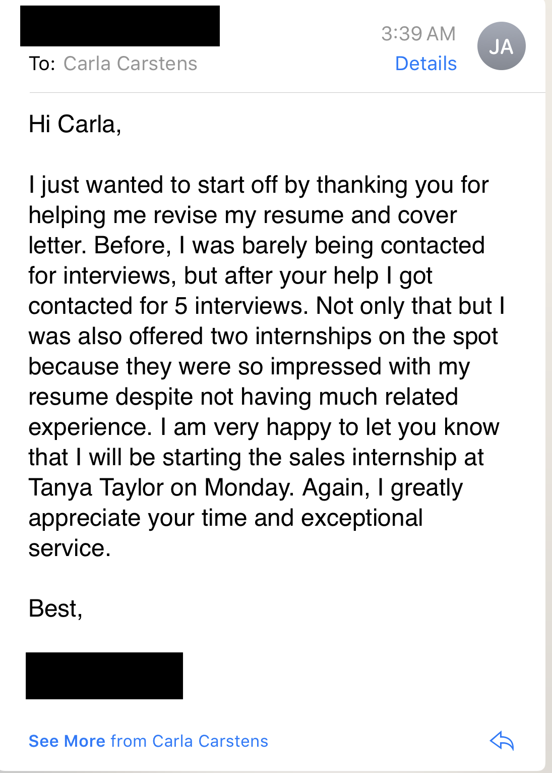“If I had not worked with Carla, I would still be applying to internships without hearing back. The investment of 3 sessions led to 3 internships with brands and stylists I dreamed of working with. I let the anxiety of getting internship experience take over my life for way too long. I now have the strength to control my emotions, and the experience I need to attain my dream career following graduation.”